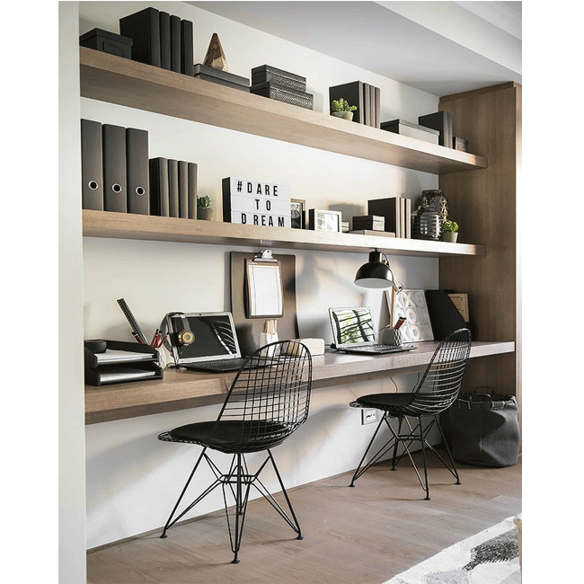 Khi bàn dài và kệ có cùng kiểu dáng và màu sắc, đó cũng là một trong những mẫu ý tưởng phổ biến hiện nay. Đặc biệt, bạn có thể áp dụng thiết kế này vào phong cách Scandinavia hay tối giản.