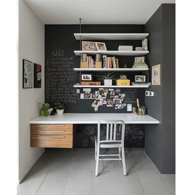Với diện tích hạn chế? Đừng quá lo lắng hãy tận dụng một góc nhỏ bố trí bàn làm việc kết hợp với tường sơn từ tính màu đen, thế là bạn có thể ghi chú, viết tin nhắn trên cảm hứng hoặc để sử dụng khi cố gắng giải quyết một vấn đề hoặc cần cảm hứng và ý tưởng.