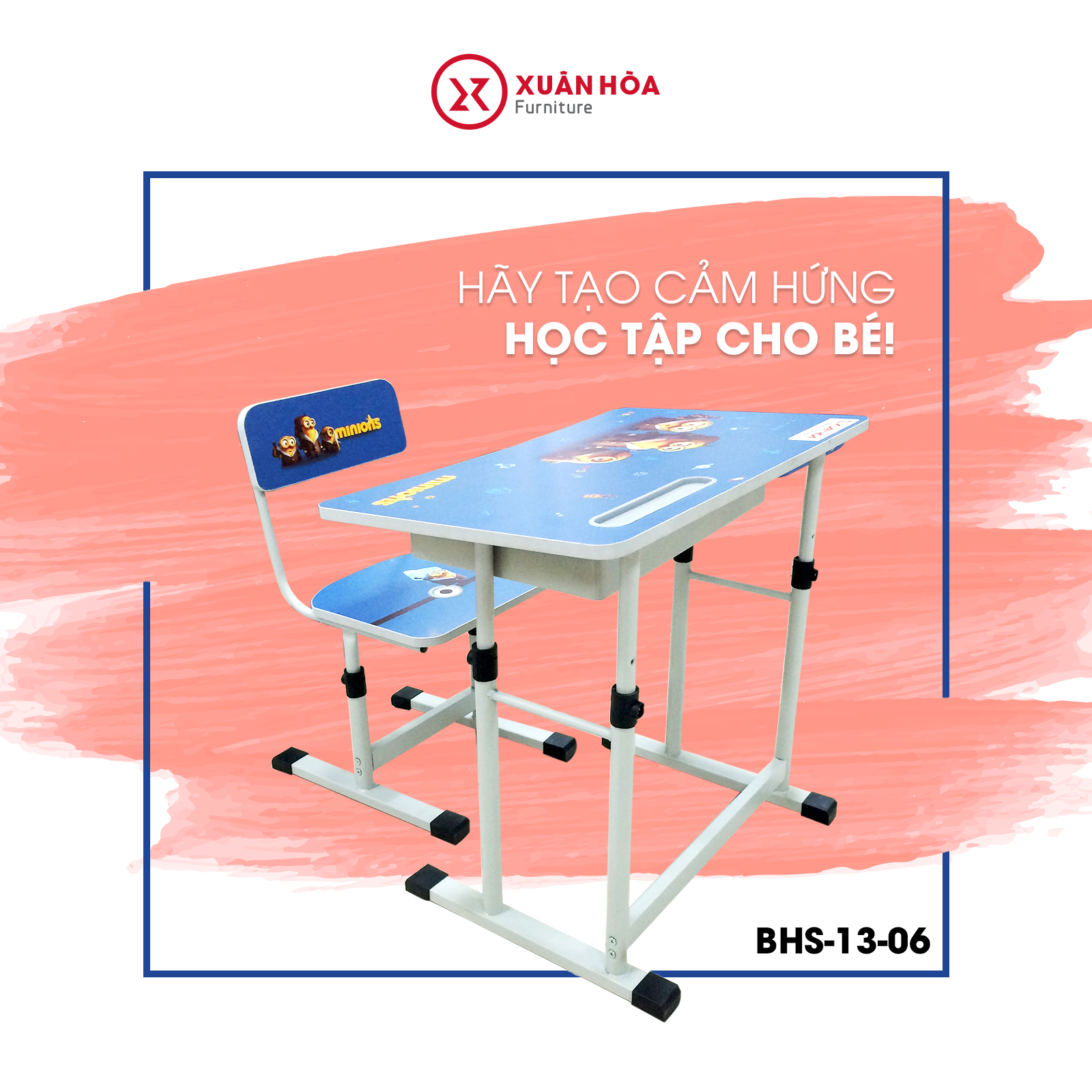 Sản phẩm bàn học sinh (BHS-13-06) vừa đảm bảo cho bé một tư thế ngồi học đúng nhất, vừa giúp bé hứng thú hơn với việc học bằng những hình vẽ nhân vật hoạt hình ngộ nghĩnh như là những người bạn đồng hành cùng bé trong những bài học đầu đời. Sản phẩm có các đặc điểm: