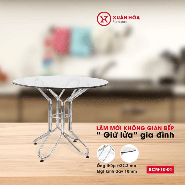 Xuân Hòa xin gợi ý chiếc bàn tròn tiết kiệm diện tích cho những gian bếp nhỏ nhắn với mặt bàn thủy tinh góp phần làm sáng không gian và kết cấu chân thép bền vững.
