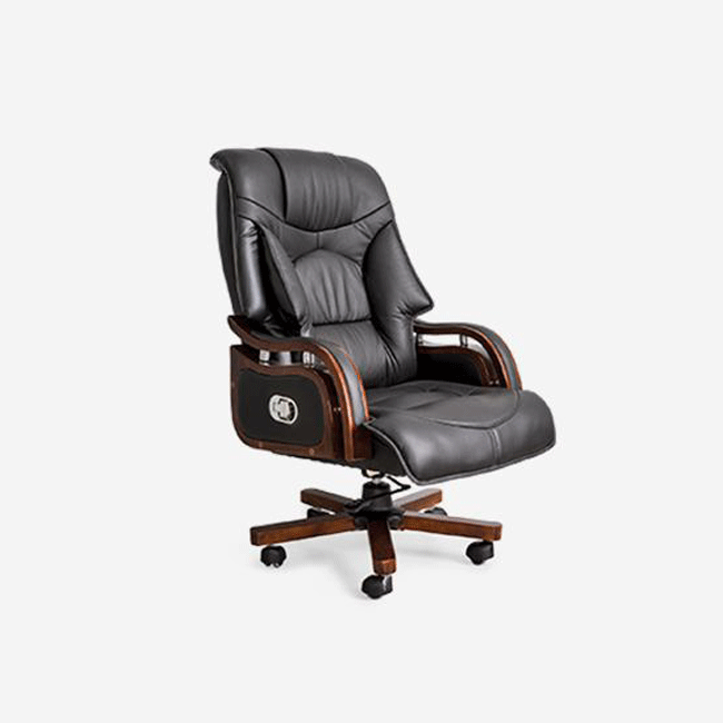 Ghế xoay cao cấp dành cho vị trí lãnh đạo. Tay và chân ghế làm bằng gỗ tự nhiên. Mặt ngồi và tựa lưng (phần tiếp xúc với lưng ) đệm mút bọc da thật. Tựa ngả đàn hồi, điều chỉnh độ cao linh hoạt.