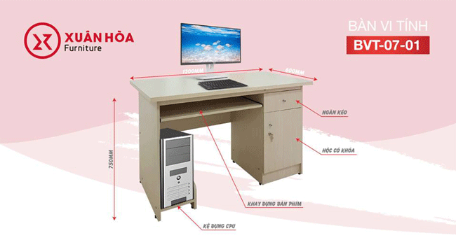 Bàn vi tính Xuân Hòa hội tụ đầy đủ vẻ đẹp của một chiếc bàn vi tính thời đại mới với những tính năng mới mẻ và đa dạng, đây là lí do để sản phẩm của chúng ta trở thành sản phẩm được ưa chuộng nhất hiện nay. Bàn có độ bền lớn so với thời gian, màu sắc lịch sự, trang trọng và hài hòa với mọi không gian. Hơn nữa, giá cả lại vô cùng hợp lý và phù hợp đối với nhiều người tiêu dùng.