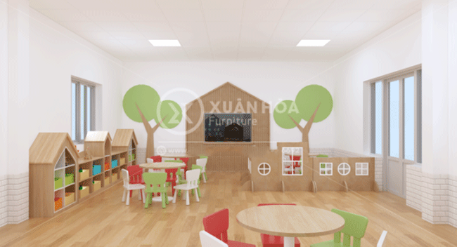 Nội thất nhà trẻ cần dùng những đồ nhỏ gọn, dễ di chuyển, đồng thời cần có tính thẩm mỹ cao, có màu sắc hoa văn tươi sáng, hình ảnh bắt mắt hợp với độ tuổi của trẻ.