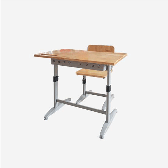 Bộ bàn học sinh ghế rời. Khung bàn sử dụng ống thép sơn bột tĩnh điện. Mặt bàn và ghế làm bằng gỗ cao su tự nhiên.