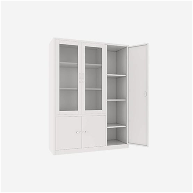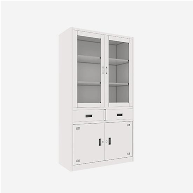 - Loại tủ sắt đựng tài liệu này được thiết kế với 2 khoang. Khoang trên có 2 cánh kính và sử dụng chung 1 khóa, phía bên trong cũng được trang bị 2 đợt di động. Khoang dưới là 2 cánh thép khác với khoang trên thì 2 cánh này được trang bị riêng 2 khóa cho mỗi cánh và sử dụng tay nắm làm bằng nhựa.