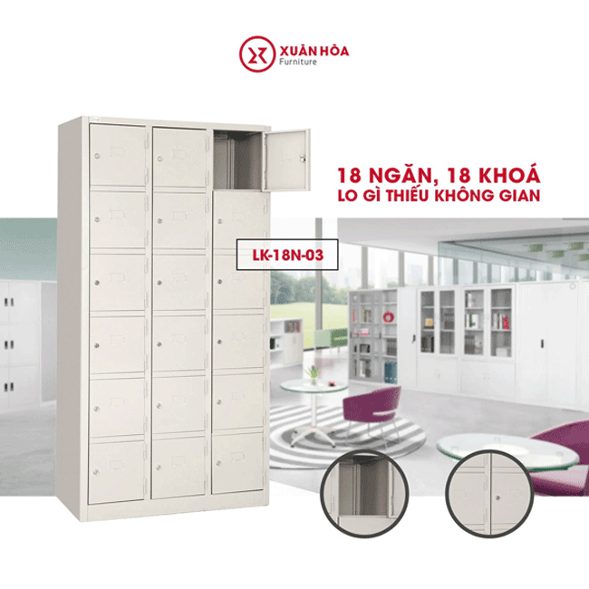 - Tủ chia ra thành nhiều ô gồm 18 ngăn, 18 khóa