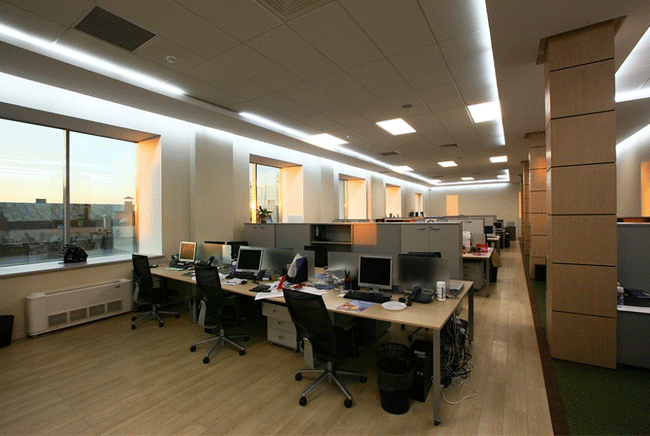 Trần nhà được thiết kế đơn giản với hệ thống đèn LED, đảm bảo đủ ánh sáng cho tất cả nhân viên song không gây rối mắt hay nặng nề thêm cho không gian.