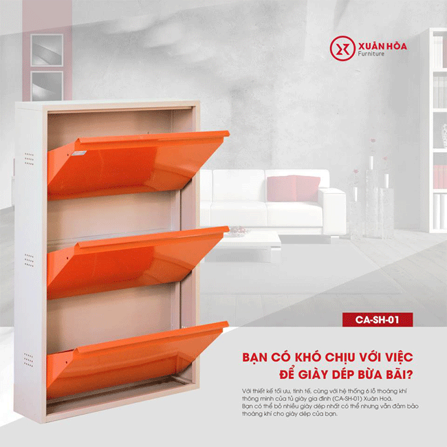 Với thiết kế tối ưu, tinh tế, cùng với hệ thống 6 lỗ thoáng khí thông minh của tủ giày gia đình (CA-SH-01) Xuân Hoà. Bạn có thể bỏ nhiều giày dép nhất có thể nhưng vẫn đảm bảo thoáng khí cho giày dép của bạn.