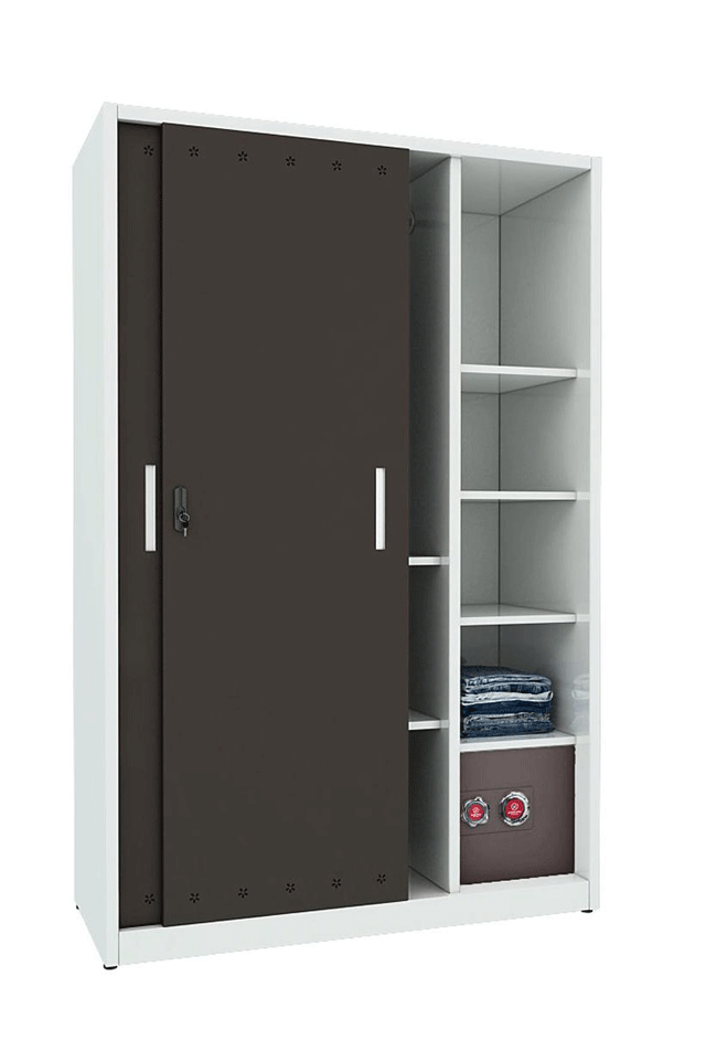 Tủ cánh lùa CA-10A-2K có thiết kế 2 khoang riêng biệt. Khoang trái gồm thanh treo móc áo và 2 đợt di động chia thành 2 ngăn tủ. Khoang phải gồm 3 đợt di động chia thành 4 ngăn tủ. Đặc biệt, khoang phải còn có một ngăn két được bảo mật bằng khóa số cực kỳ an toàn giúp bạn cất giữ những đồ vật có giá trị.