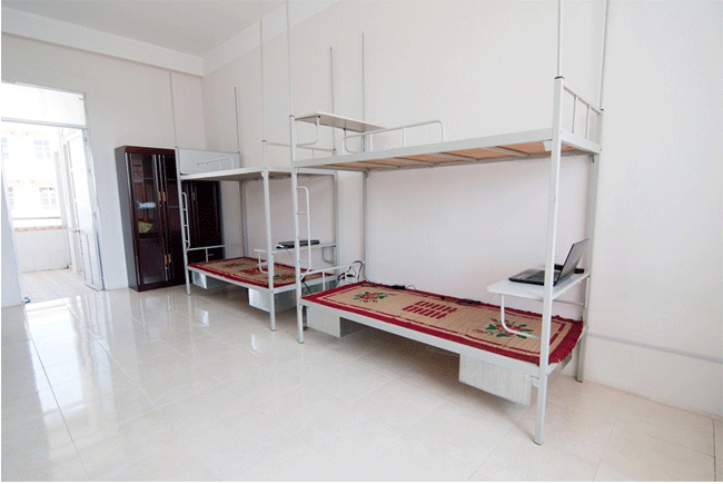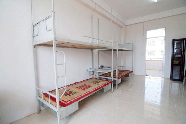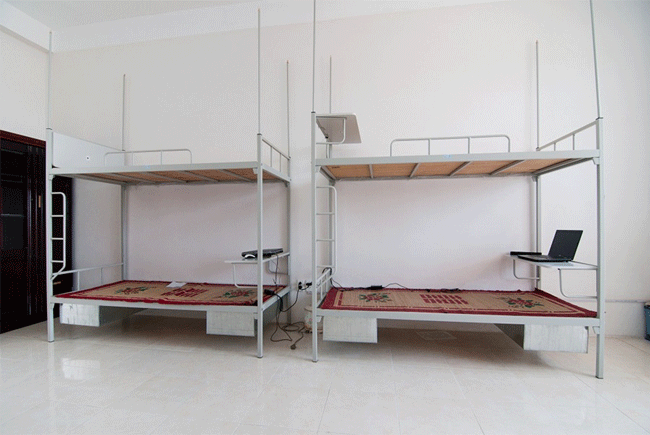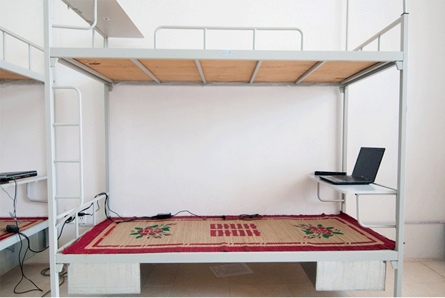 Tại KTX Hải Dương, cứ 2 giường tầng được xếp cạnh nhau, được lắp thêm cọc màn để sử dụng khi đi ngủ. Kết hợp giường tầng Xuân Hòa với các nội thất khác như tủ quần áo, bàn ghế thiết kế đơn giản sẽ tạo được một không gian hiện đại và tiện nghi.